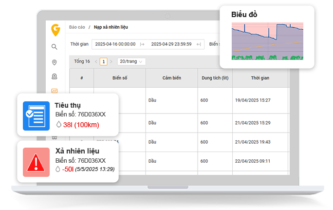 Nhà quản lý theo dõi chi tiết về mức tiêu thụ nhiên liệu theo thời gian thực. Xác định nguyên nhân kém hiệu quả và triển khai chiến lược để tối ưu hóa việc sử dụng nhiên liệu, nâng cao hiệu quả kinh doanh.